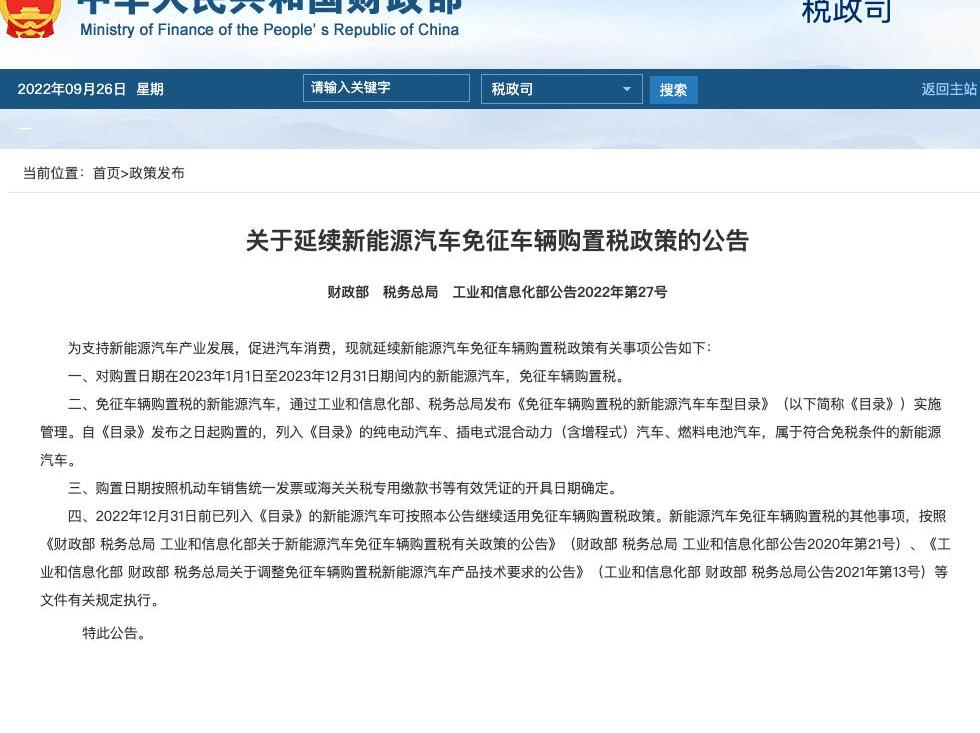 9月26日,財政部、國家稅務總局、工業和信息化部發布《關于延續新能源汽車免征車輛購置稅政策的公告》指出,對購置日期在2023年1月1日至2023年12月31日的新能源汽車免征車輛購置稅。