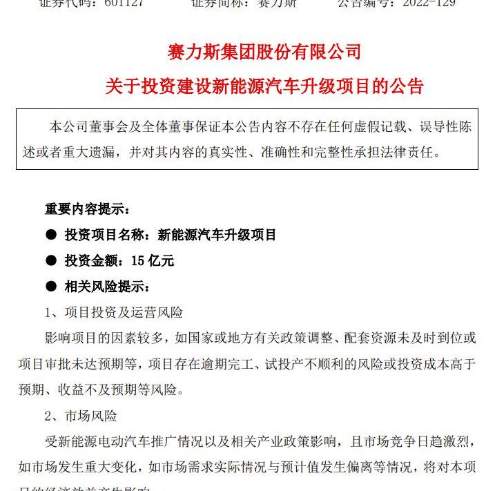 9月29日,賽利斯集團發布《關于投資新能源汽車升級項目的公告》,該項目擬在重慶兩江新區建設,預計投資15億元人民幣,預計2023年9月30日竣工。