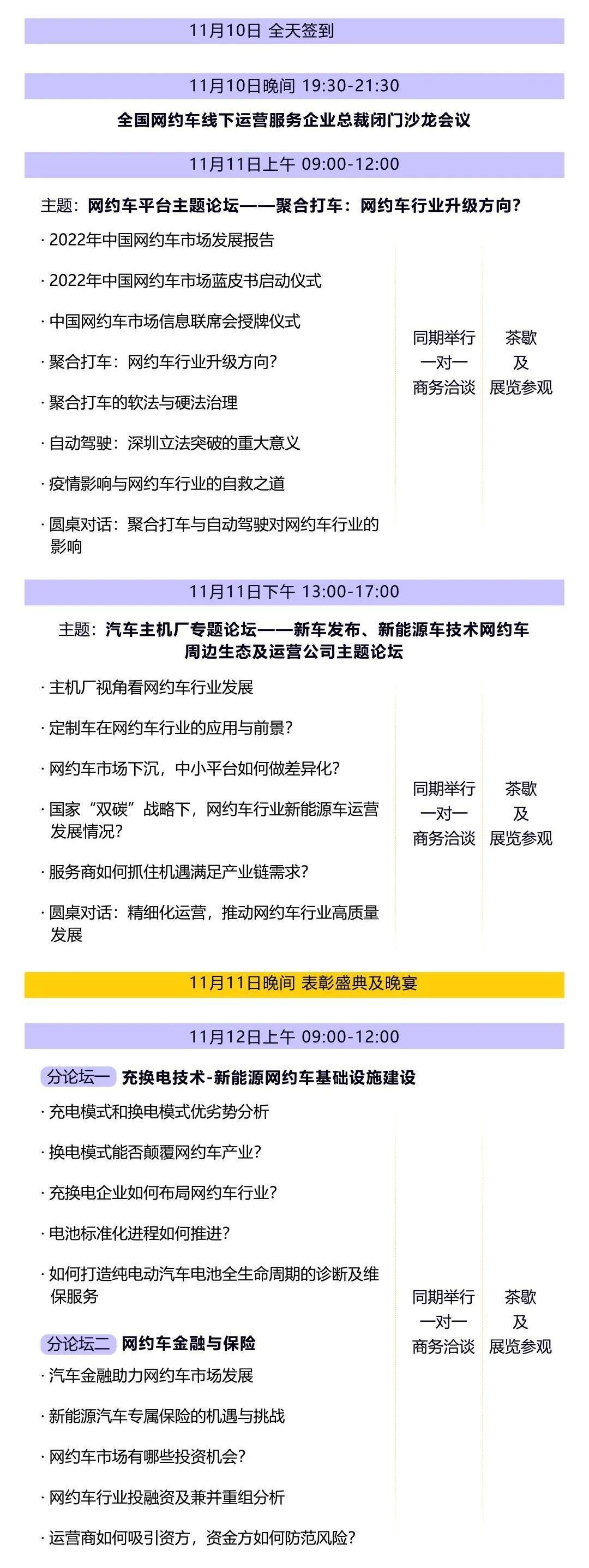 近年來,我國網約車行業發展迅速。雖然受疫情影響,但市場規模和滲透率持續擴大。2021年1月至2022年6月,中國在線汽車共享平臺數量從218家增加到277家,平均每月增加約3家,訂單恢復趨勢正在改善。2025年,中國網約車市場規模有望達到4341億元,2022-2025年中國網約車市場復合增長率約為10%。網約車市場爭奪戰進入下半場,聚合平臺模式快速發展。經過三年的快速發展,高德已經成為業內第二大品牌。與此同時,華為、騰訊等頭部企業和流量平臺也通過聚合打車模式切入網絡出行領域,網約車行業面臨重大變革。目前一線城市發放的網約車牌照已經成為新能源車,網約車和出租車車型新能源化已經是大勢所趨。網約車新能源一方面是政策引導,另一方面是司機考慮成本,有軌電車成本低于油車。然而,“里程焦慮”、充電時間長、排隊時間長仍是新能源網約車市場的發展痛點。因此,基于較高的市場需求,一些車企和電池廠商為了解決充電焦慮,相繼加入換電業務。作為運營車輛,什么樣的新能源汽車適合線上市場?如何在充換電基礎設施方面為網絡行業賦能,成為行業關注的焦點。在此背景下,中國城市公共交通協會網約車分會、通達汽車產業研究院邀請行業領導、專家學者、平臺、運輸運營商、資助方、車企、后市場企業等行業代表,于2022年11月10-12日在廈門舉辦“第四屆中國網約車產業峰會(主題:融合共贏)暨網約車配套產業展覽會”,就上述問題展開。主辦方中國城市公共交通協會網約車分會通達汽車產業研究院聯合主辦廈門市新能源汽車行業協會廈門市汽車租賃和汽車共享服務行業協會廣東省汽車租賃行業協會山西省網絡汽車租賃行業協會遼寧省網絡汽車租賃行業協會湖北省電動汽車流通協會重慶市出租汽車和汽車租賃協會網絡汽車租賃行業協會會議時間:2022年11月10-12日會議地點:廈門會議規模:500+議程如下: