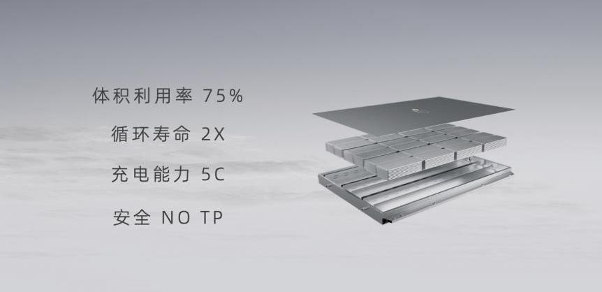 采用大型柔性電芯水平排列設計的富能SPS,電池系統組件減少50%,材料成本降低33%,體積利用率提高到75%。福能SPS與搭載4680圓柱電池的機型相比,體積利用率高12%,循環壽命3次,導熱系數高60%。