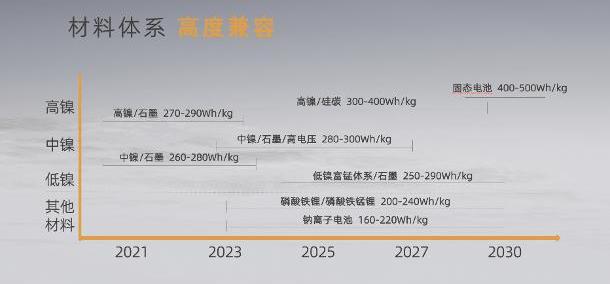得益于與材料體系的高度兼容性,大柔性電芯可用于高鎳三元至低鎳富鋰錳、磷酸錳鋰、鈉離子等材料體系,滿足不同需求。除了三元材料,富能科技還在發布會上首次系統展示了其他材料體系的研發路線。鈉離子電池、磷酸亞鐵鋰、磷酸錳鋰等。計劃2023年推出第一代產品,目標到2030年將鈉離子電池能量密度從160Wh/kg提升至220Wh/kg,磷酸亞鐵鋰和磷酸錳鋰能量密度形成200Wh/kg至240Wh/kg的產品覆蓋。低鎳方面,福能科技計劃2024年推出250Wh/kg低鎳富錳體系產品,2030年有望進一步提升至290Wh/kg。