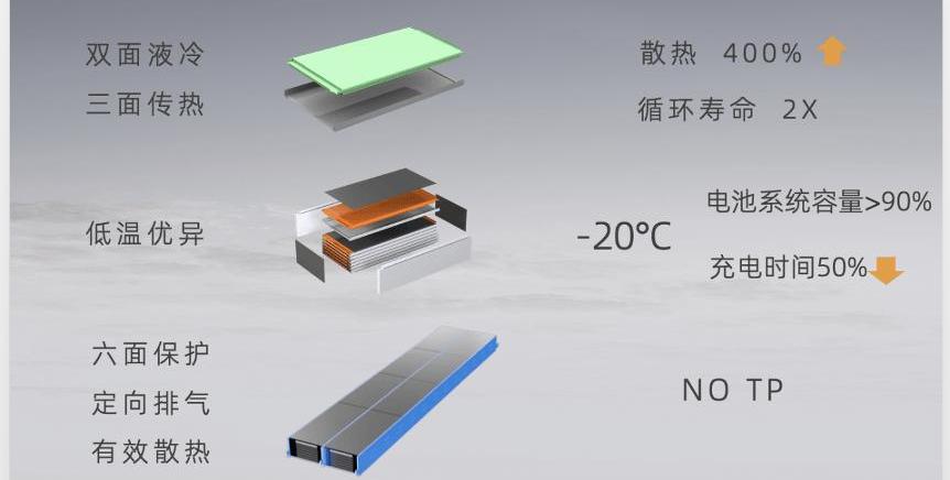 同時,體積利用率再創新高,高效液冷板和導熱板的組合使用,為大軟包電芯提供了高效的熱交換,使電池系統的散熱效率提高了4倍。精確而全面的溫度控制,使電池系統循環壽命超過3000次。在此基礎上,多種材料形成對大型柔性電芯的6面保護,配合高效排氣通道和換熱能力的設計,SPS大型柔性電芯系統依然可以實現8系或更高鎳含量單體電芯的熱失控和不擴散(NO TP)。低溫性能方面,大型軟包電池的全極耳和層壓工藝為電池帶來了更低的內阻和更好的低溫放電性能;液冷板和納米隔熱材料的加入,平衡了電池系統內部溫度;為了滿足極寒條件下的正常充電,SPS應用了全新的低溫快速自熱設計。實驗數據表明,SPS系統在零下20攝氏度的環境下,容量始終保持在90%以上,充電時間縮短了一半。