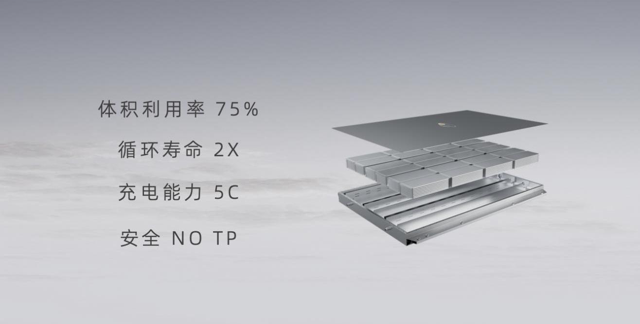 采用大型柔性電芯水平排列設計的富能SPS,電池系統組件減少50%,材料成本降低33%,體積利用率提高到75%。福能SPS與搭載4680圓柱電池的機型相比,體積利用率高12%,循環壽命3次,導熱系數高60%。