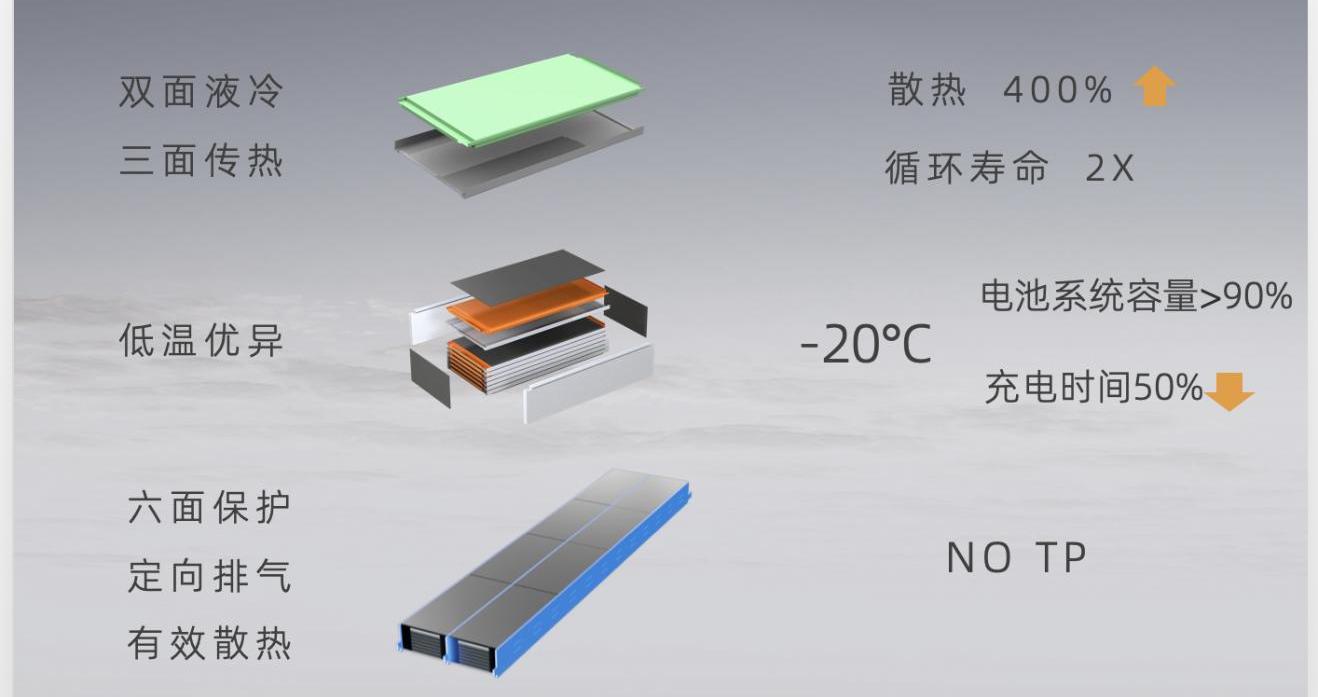 同時,體積利用率再創新高,高效液冷板和導熱板的組合使用,為大軟包電芯提供了高效的熱交換,使電池系統的散熱效率提高了4倍。精確而全面的溫度控制,使電池系統循環壽命超過3000次。