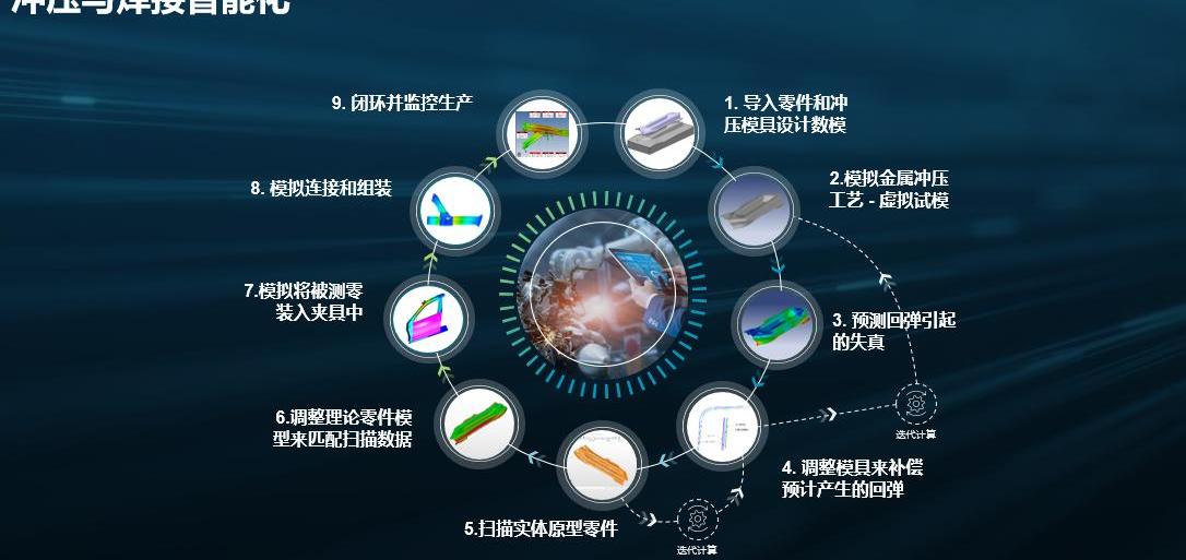 我總結了一下過程。在傳統沖壓焊接工藝的基礎上,進行了仿真迭代和實時數據導入,從而加快了整體流程。之前的一些步驟其實和傳統工藝是一樣的,比如導入零件,設計沖壓模具的數值模型。在模擬金屬沖壓過程——虛擬模具試驗的過程中,我們會借用軟件做一些虛擬仿真。在預測回彈引起的畸變的過程中,原來需要人工嘗試,現在可以更多的依靠軟件。