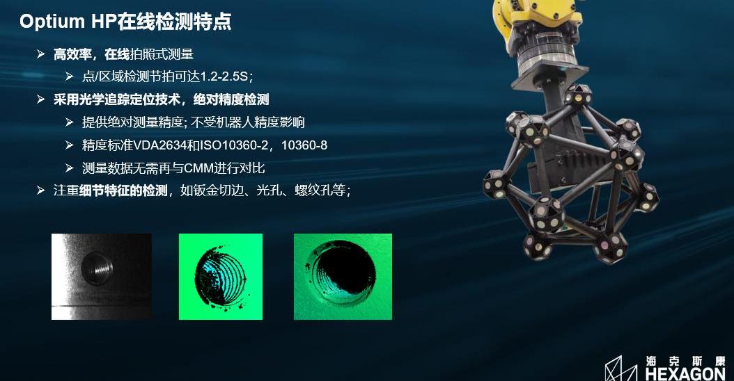 針對汽車車身在線檢測,海克斯康提供Optium HP 2022 3D快照檢測系統,該系統采用最新的光學跟蹤技術和快照絕對檢測技術,提供穩定可靠的系統精度< < 100μm m,是真正的絕對自動在線檢測系統。具有絕對檢測精度、布局靈活、自動多傳感器系統檢測的特點。