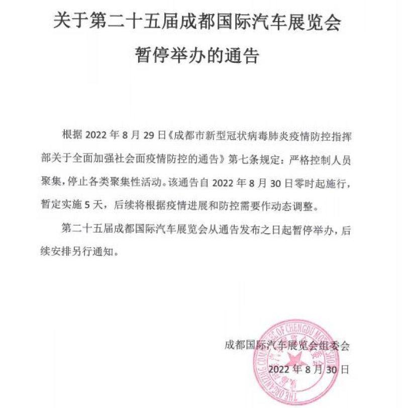 8月30日,成都車展2022官方公告表示,8月30日零時起車展暫停五天,后續安排另行通知。到目前為止,2022成都車展只持續了4天。