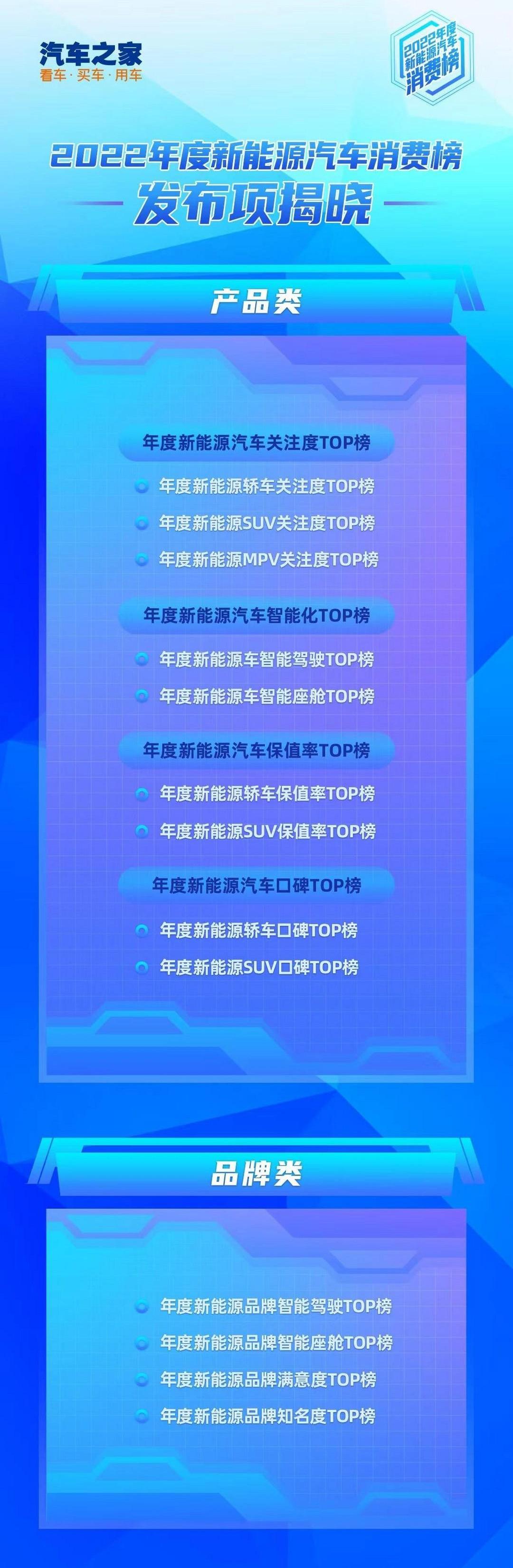 《2022年新能源汽車消費排行榜》基于汽車之家大數據,整合了過去一年關注新能源產品的人數、產品保值率、產品口碑、產品智能座艙、智能駕駛相關達標率等維度。深入c之后……型坯、分析、計算、多輪校對,形成了年度新能源汽車關注度TOP榜、年度新能源汽車智能TOP榜、年度新能源汽車保值率TOP榜、年度新能源汽車口碑TOP榜四大產品類別,以及年度新能源品牌智能駕駛TOP榜、年度新能源品牌智能駕駛艙TOP榜、 年度新能源品牌滿意度TOP list和年度新能源品牌認知度TOP list,最終形成13個子榜單,為用戶選購新能源產品提供權威、專業、有價值的參考。 產品類別年度新能源汽車關注度TOP榜“新能源汽車關注度TOP榜”由三個榜單組成:新能源汽車關注度TOP榜、新能源SUV關注度TOP榜、新能源MPV關注度TOP榜。該榜單以汽車系列的月均關注人數為評價指標,按照車輛級別從高到低排序,從而對消費者心目中關注度最高的新能源汽車進行排名。