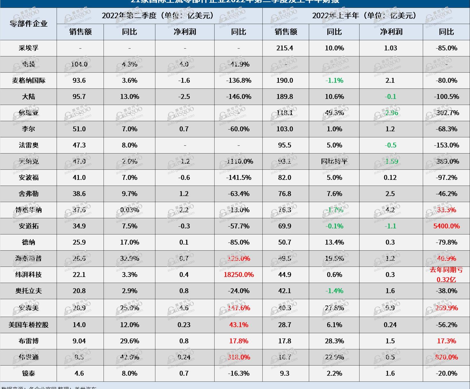 在這種背景下,零部件公司正在努力創收。加斯帕編制了21家國際主流零部件公司上半年的財務報告……年,而且大部分都成功實現了銷售額的增長,但有超過60%的企業在不增加利潤的情況下增加了收入,其中有5家甚至出現了凈虧損。從具體金額來看,ZF的收入排名第一,達到215億美元,領先麥格納國際和大陸集團超過25億美元。但凈利潤的領頭羊不是傳統零部件巨頭,而是安森美。