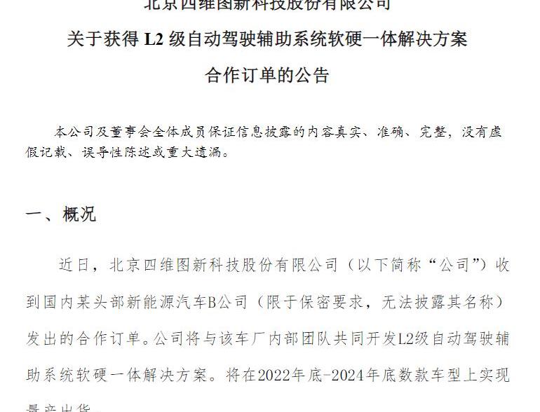 8月16日,四維圖新發布公告稱,公司近日收到國內某頭部新能源汽車公司B的合作訂單(限于保密要求,不能透露其名稱)。該公司將與車廠內部團隊合作開發L2自動駕駛輔助系統軟硬件一體化解決方案,并將于2022年底至2024年底在多款車型上實現量產出貨。
