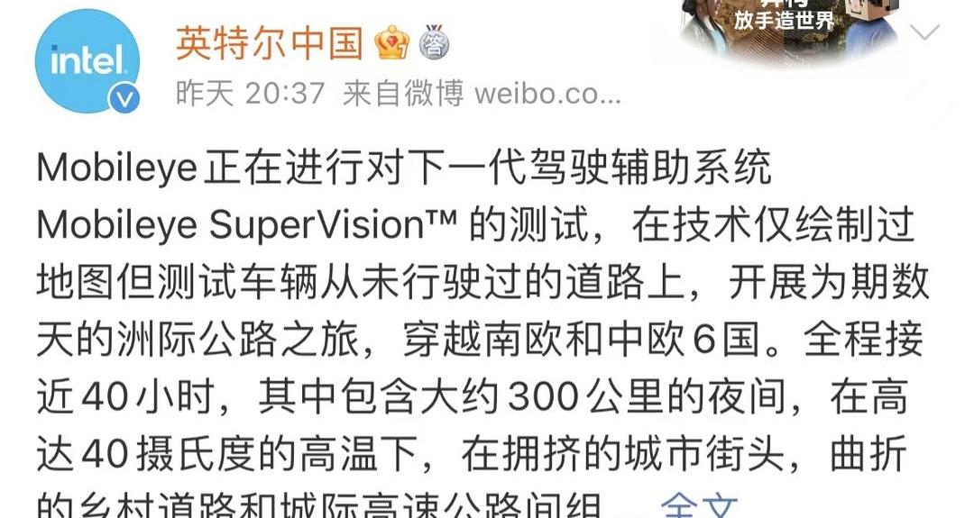 8月16日晚,英特爾中國官方宣布Mobileye正在測試下一代駕駛輔助系統Mobileye SuperVision。測試是為期幾天的洲際公路旅行。車輛行駛在僅在技術上繪制的道路上,但測試車輛從未行駛過。全程將近40個小時。行駛路段由城市街道、鄉村道路和城際公路組合完成,其中夜間行駛約300公里,測試環境溫度高達40攝氏度。