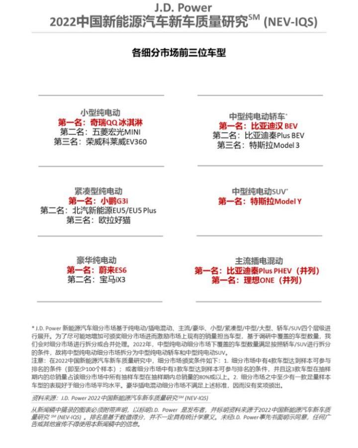 全球領先的消費者洞察和市場研究機構J.D. Power(帝俊)于8月4日正式發布了《2022中國新能源汽車品質研究SM(NEV-IQS)》和《2022中國汽車智能體驗研究SM(TXI)》。NEV-IQS研究表明,與傳統自主品牌和國際/合資品牌相比,自主新品牌的質量表現仍然保持領先,在車身內飾和車身外觀方面的質量優勢更加顯著。J.D. Power中國新能源汽車品質研究(NEV-IQS)始于2019年,基于J.D. Power行業常用的新車品質研究IQS體系,補充了新能源汽車特有的問題。本研究統計和測量了新能源汽車車主在2-6個月的擁有期內遇到的質量問題。新車質量用每100輛車的平均問題數(PP100)來表示。問題數量越少,質量越好。研究顯示,2022年自主新勢力品牌質量問題總數為149 PP100。與傳統自主品牌(152 PP100)和國際/合資品牌(153 PP100)相比,自主新勢力品牌在新能源汽車新車質量表現上保持領先,尤其是車身內飾和車身外觀的質量表現,分別領先全行業2.5 PP100。此外,在駕駛體驗、動力總成、電池/充電方面的表現也優于行業整體質量水平。新能源汽車行業整體質量表現不如去年:2022年新能源汽車行業整體質量問題152個PP100,比2021年增加24個PP100。其中,車身內飾問題成為投訴最多的問題類別,配置/控制系統/儀表盤的投訴比例增幅最大,比上年增加了2.3%。純電動汽車在智能上的領先優勢降低:在智能品質表現上,純電動汽車與插電式混合動力汽車的差距正在逐漸縮小。2021年,純電動汽車的智能問題數量比插電式混合動力汽車少8.1個PP100,而2022年,純電動汽車的質量問題數量僅比插電式混合動力汽車少1.1個PP100。新能源汽車車型電池問題比延續車型少,表明新能源汽車行業正在逐步擺脫三電限制:與延續車型相比,新能源汽車車型在電池/充電和配置/控制系統/儀表盤方面表現更好,分別比延續車型下降1.4 PP100和1.3 PP100,新能源汽車行業已經呈現出逐步擺脫三電限制的趨勢。延續版車型在信息娛樂系統和駕駛輔助方面優勢明顯,問題數量比新款車型減少了3.8個PP100和2.1個PP100。