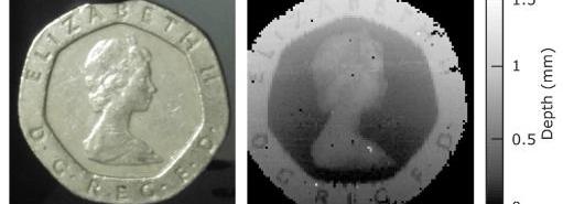a)雙光子干涉激光雷達概念的工作原理;b)實驗裝置示意圖。研究小組表示,探測光子對相關態可以比普通干涉更精確地測量光子離開并返回所需的時間,這轉化為更大的深度分辨率。根據這個項目的計算,平臺的理論深度分辨率可以小到7微米。在他們的實驗中,研究人員通過檢測大約2毫米厚的玻璃的兩個反射表面,證明了雙光子干涉激光雷達的高深度分辨率。傳統的激光雷達無法區分這兩個表面,但現在上述研究團隊可以通過測量做到這一點。在實驗中,研究人員使用新開發的激光雷達對一塊厚度約為2毫米的玻璃的兩個反射面進行成像,這與傳統的激光雷達難以區分,并以3D方式對一枚20便士的硬幣進行成像。但目前要提高深度分辨率需要更長的成像時間,生成一個20p硬幣的3D圖像需要10個小時以上。然而,研究小組設想了一種多脈沖相關方法,在大約30秒內達到相同的結果。