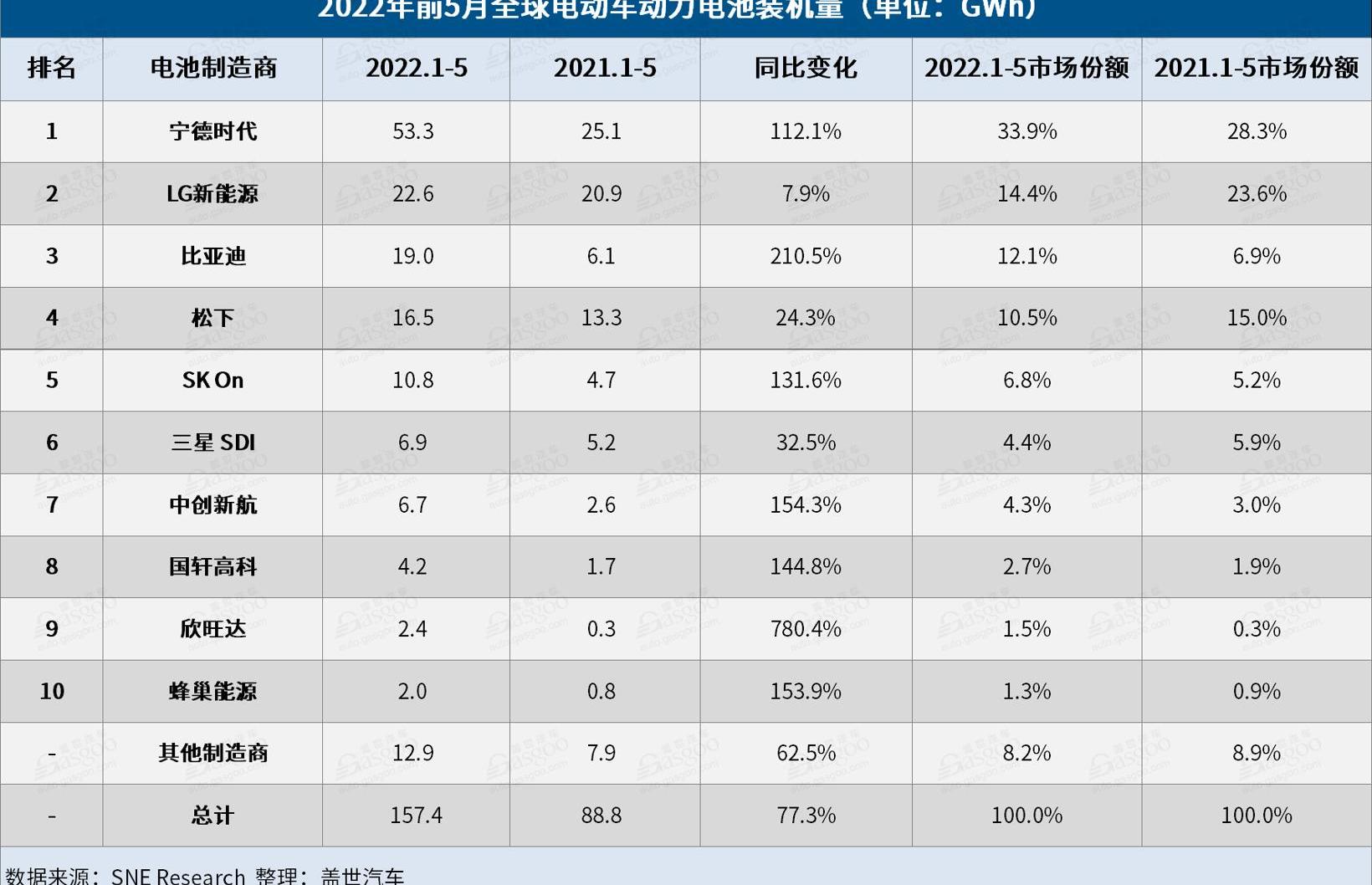 根據韓國市場研究機構SNE研究公司發布的數據,今年前5個月,三星SDI在全球電動汽車電池市場的份額為4.4%,遠低于當代安培科技有限公司的34%和LG新能源的14%。今年5月,三星SDI宣布計劃與Stellantis合作,在印第安納州投資25億美元建立其在美國的第一家電池工廠。