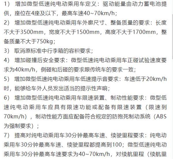近日,工信部牽頭的《純電動乘用車技術條件》修訂工作座談會紀要曝光,9月份將發布《純電動乘用車技術條件》修訂版。會議紀要的內容有以下核心點:1。《純電動乘用車技術規范》修訂版將增加微型低速電動乘用車的定義,低速電動汽車標準不再另行發布。2.技術要求全面升級,對碰撞試驗、整車質量、電機性能、爬坡性能甚至胎壓檢測都有了硬性要求。3.提高電池能量密度的要求:微型低速純電動乘用車的能量密度應不低于70wh/kg。4、部委不接受鉛酸電池,低速車只能用磷酸亞鐵鋰或者三元鋰電池。5.增加車輛標識和標識要求:增加微型純電動乘用車的“微電”標識要求。6.低速電動車不計入雙倍積分,沒有補貼。