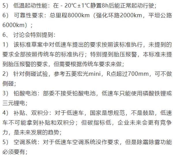 近日,由工信部牽頭的《純電動乘用車技術條件》修訂工作座談會紀要曝光,修訂版《純電動乘用車技術條件》將于9月發布。會議紀要的內容有以下核心點:1。《純電動乘用車技術規范》修訂版將增加微型低速電動乘用車的定義,低速電動汽車標準不再另行發布。2.技術要求全面升級,對碰撞試驗、整車質量、電機性能、爬坡性能甚至胎壓檢測都有了硬性要求。3.提高電池能量密度的要求:微型低速純電動乘用車的能量密度應不低于70wh/kg。4、部委不接受鉛酸電池,低速車只能用磷酸亞鐵鋰或者三元鋰電池。5.增加車輛標識和標識要求:增加微型純電動乘用車的“微電”標識要求。6.低速電動車不計入雙倍積分,沒有補貼。