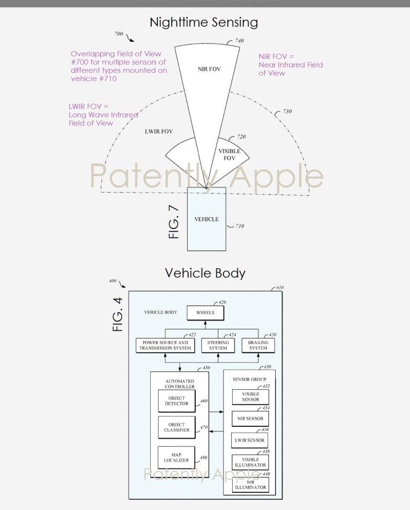 蘋果表示,夜晚或弱光環境對自動車輛控制系統來說非常具有挑戰性。例如,車輛前燈在夜間發出的光強度可能會受到法律或法規的限制,法律或法規可能會限制用于在車輛路徑中或附近進行檢測的可見光傳感器(如攝像機)的有效監控范圍。