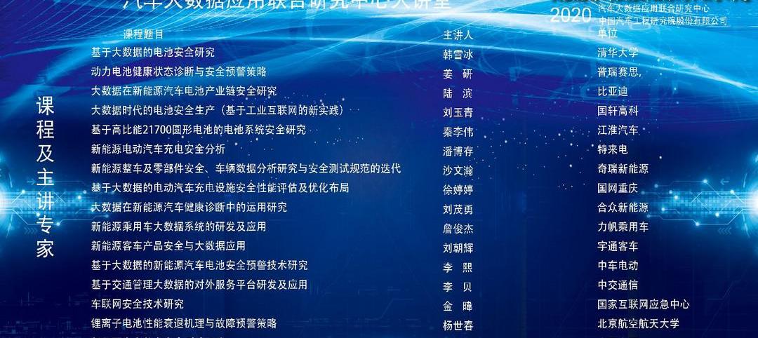 本次大講堂由汽車大數據應用聯合研究中心和中國汽車工程研究院有限公司聯合主辦,通過匯聚行業力量,整合行業資源,邀請來自企業、高校、行業組織、政府管理部門的16位專家聚焦新能源汽車安全,以汽車大數據應用聯合研究中心2020年成果之一為基礎,圍繞電池安全、整車安全、充電安全、預警研究、測試評估、綜合應用。9月16日起,汽車大數據應用聯合研究中心報告廳每周三與您一起探討新能源汽車的安全性。掃碼關注。課程正式上線后,回復“課堂”,即可獲得免費課程鏈接。