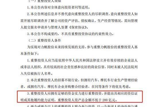 如此沉重的債務逐漸將力帆推向了破產退市的邊緣。8月25日,力帆實業股票被試行退市風險警示,股票名稱變更為st力帆,連續四天的漲停讓公司雪上加霜。但在債務問題被法院裁定進入重組程序后,力帆股份正式宣布引入重組投資者,要求重組投資者總資產不低于200億元。