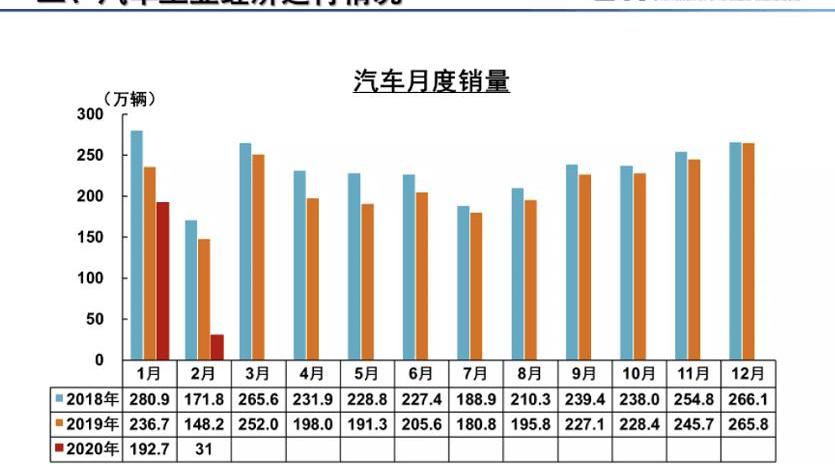 3月12日下午,受疫情影響,中汽協再次召開網上月度信息發布會,發布2020年2月汽車行業產銷情況。2020年2月,受新冠肺炎疫情嚴重影響,汽車行業產銷量大幅下滑。在生產端,由于復工進度和零配件供應緩慢,企業產出水平較低;在消費端,產品消費停滯,市場需求受到嚴重抑制,這將對上半年的汽車市場產生重大影響。具體數據顯示,2020年2月,汽車產銷分別完成28.5萬輛和31萬輛,環比下降83.9%,同比下降79.8%和79.1%。前兩個月,汽車產銷分別完成204.8萬輛和223.8萬輛,產銷量同比分別下降45.8%和42%。