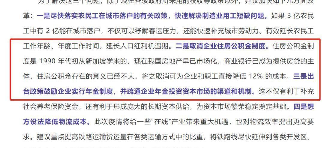 圖片來源:清華大學互聯網產業研究院事實上,取消強制性公積金制度的建議由來已久。中國人民協商會議經濟委員會副主任楊偉民多次呼吁逐步取消強制性住房公積金,逐步將強制性住房公積金改為自愿存款,并建立政策性住房金融機構。但是,是否取消公積金強制繳納制度一直存在爭議。中國社會科學院金融研究所房地產金融研究中心主任尹中立在接受中國證券報記者采訪時表示,住房公積金制度是我國政策性住房金融體系中最重要的組成部分,對我國住房制度改革具有非常重要的推動作用。對于工薪階層尤其是年輕人完成購房,降低購房成本起到了不可替代的作用。如果中國的政策性住房金融支持,唯一的渠道就是住房公積金,住房公積金是政策性住房金融不可或缺的一部分。尹中立表示,對于確有困難的企業,可以采取暫停甚至暫時免除繳納公積金的政策,或者從整體上適當降低公積金繳存比例。“這篇文章是從新冠疫情下對經濟發展和制造業復工的幾點建議的角度出發,所以客觀上側重于企業降本的考慮。它指的是企業成本的降低,有更積極的意義。2018年5月,住建部、財政部、央行發布《關于完善住房公積金繳存機制進一步降低企業成本的通知》。在降低存款比例的基礎上,將相關政策延長至2020年4月。因此,從降低企業成本的角度出發,研究降低或取消公積金繳存的內容也是有積極意義的。當然,直接取消必須全方位論證。不排除今年4月以后,國家對企業降低住房公積金繳存比例的現有政策延長1-2年。”易居研究院智庫中心研究總監嚴躍進對中國證券報記者表示。嚴躍進認為,從目前市場反應來看,普遍認為取消公積金繳存不可行。第一,公積金繳存不完全是企業的負擔,而是企業和職工互助精神的體現。第二,雖然房地產市場化程度比較高,但是房價與房價收入比的壓力還是很大的。從這個角度來看,為了進一步減輕買家的壓力……養老基金制度不能廢除,但需要加強。第三,從目前各地公積金的工作情況來看,可貸額度增加,客觀上起到了支持購房的引導作用,購房者對公積金制度也有很大的認可和支持。中共中央局常委在2月12日召開的會議上指出,要針對疫情影響,加大宏觀政策調整力度,研究制定相應政策措施。要充分發揮積極財政政策的作用,加大資金投入,保證各地疫情防控的資金需要。要繼續研究出臺階段性、有針對性的減稅降費措施,緩解企業經營困難。要保持穩健、靈活、適度的貨幣政策,加大對防疫物資生產企業的優惠利率信貸支持,完善對受疫情影響較大的地區、行業和企業的差異化優惠金融服務。要進一步落實就業優先政策,完善支持中小企業的財稅、金融和社會保障政策。會議指出,要積極擴大內需,穩定外需。要突出重點,優化地方政府專項債券投資,用好中央預算內投資,調動民間投資積極性,加快建設一批重大項目。要促進服務消費升級和擴大,擴大實物商品消費,加快釋放新興消費潛力。要支持外貿企業快速恢復生產,加大貿易融資支持力度,充分發揮出口信用保險的作用。我們要積極參與國際協調與合作,為外貿發展創造良好的國際環境。要推動外資大項目落地,落實外商投資法和配套法規,優化外商投資環境,保護外資合法權益。對于即將出臺和已經出臺的各項經濟“抗疫”政策,接受中國證券報記者采訪的券商首席經濟學家普遍認為,財政政策因為比貨幣政策更有針對性,所以能夠取得更好的效果。中國光大集團研究院副院長、光大證券首席經濟學家彭文生表示,就宏觀政策而言,疫情對經濟的影響是短期現象,是一個重要的判斷。這意味著政策反應應該是更有針對性的支持,以幫助那些受到嚴重影響的行業、地區和群體,而不是洪水泛濫。換句話說,宏觀政策應該著眼于結構,而不是總量。雖然貨幣政策可能會比沒有疫情時寬松,但主要力量應該是財政擴張,包括減少收入和增加支出。國泰君安研究所全球首席經濟學家華長春日前在接受中國證券報記者采訪時表示,財政政策方面,建議發行專項國債。財政赤字率可以顯著改善,特殊時期3.5%的赤字率是可以接受的,也是合理的。加大對受影響較大行業的稅收減免力度,如減免企業所得稅、增值稅、政府性基金等。,加大對他們一季度稅前扣除的范圍和力度,甚至對這些企業的人工成本和租賃成本給予一定的財政補貼。同時,地方政府的財政收入也必然受到影響。此時,政府融資工具應適當拓寬。例如,它可以幫助地方政府發行REITS產品,以盤活運營基礎設施的現有資產。經濟“抗疫”到了關鍵時刻。最近有經濟學家就如何應對疫情對民生的影響出謀劃策。其中,黃、、陳……清華產業轉型咨詢委員會的rman,寫了一篇關于疫情對中國經濟發展和制造業影響的文章,建議取消企業住房公積金制度,引起了市場的廣泛討論。