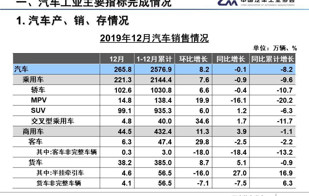 1月13日,中汽協發布了2019年12月及全年汽車行業產銷數據。2019年12月,汽車產銷分別完成268.3萬輛和265.8萬輛,同比增長8.1%,同比增長3.5%;銷售額環比增長8.2%,同比下降0.1%。總體來看,2019年汽車產銷分別完成2572.1萬輛和2576.9萬輛,同比分別下降7.5%和8.2%。產銷量降幅比上年分別擴大4.2和5.4個百分點,繼續居世界首位。2019年,我國汽車行業面臨的壓力進一步加大,產銷和行業主要經濟運行指標均出現負增長。從月度產銷趨勢來看,我國汽車產銷形勢正在逐步好轉。