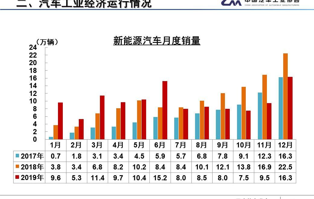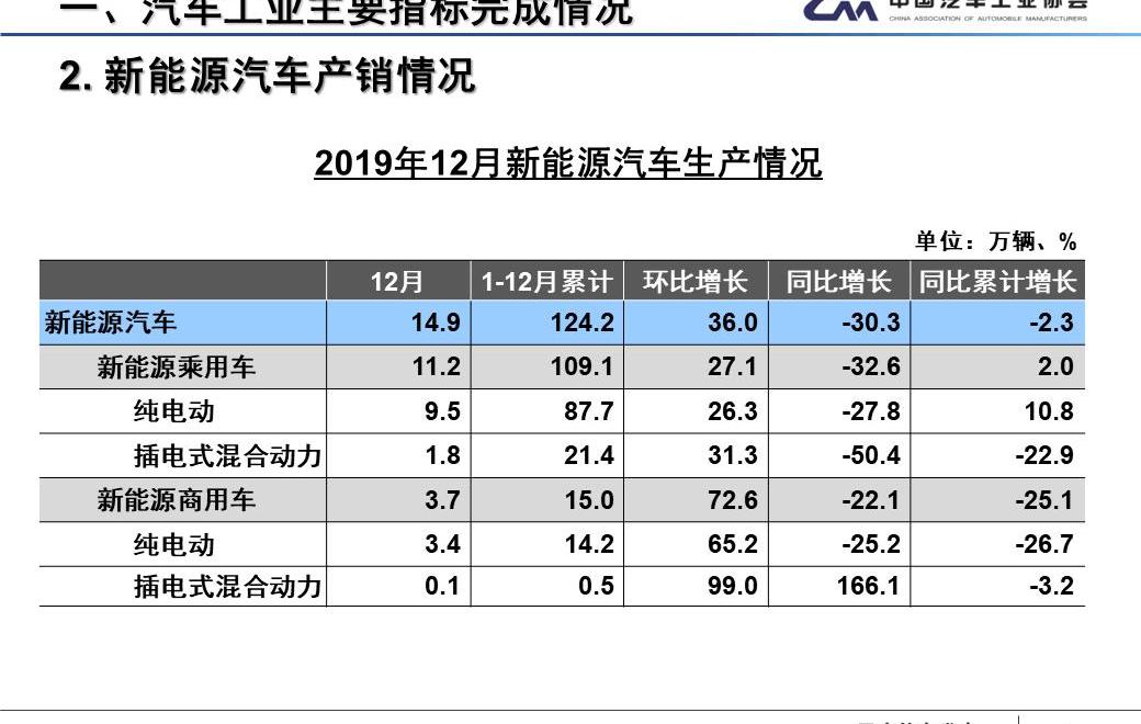 新能源汽車方面,同比下滑趨勢延續。12月份,新能源汽車產銷分別完成14.9萬輛和16.3萬輛,同比下降30.3%和27.4%。