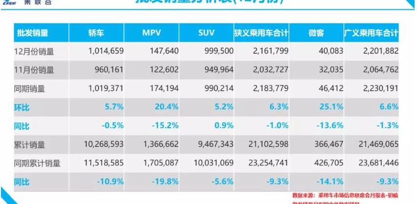 1月9日,乘用車聯合會發布了2019年12月全國乘用車產銷數據。1月份,廠商批發銷量216.2萬臺,同比下降1%,環比增長6.3%。相比往年12月的漲幅,今年12月的批發銷量并不強勁,全年的市場走勢也趨于理性。乘用車聯合會預測,汽車市場將在2019年走出底部,2020年乘用車增速將較2019年的- 8%有明顯改善。目前樂觀估計增長率為1%。