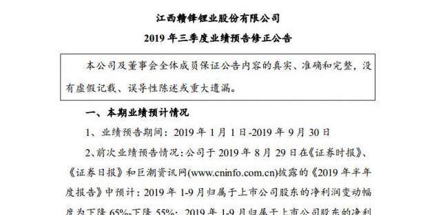 10月14日,深交所上市公司江西贛鋒鋰業股份有限公司(以下簡稱“贛鋒鋰業”,股票代碼300474)發布2019年第三季度修正公告。預計前三季度歸屬于上市公司股東的凈利潤為3-4億元,同比下降63.85%-72.89%。