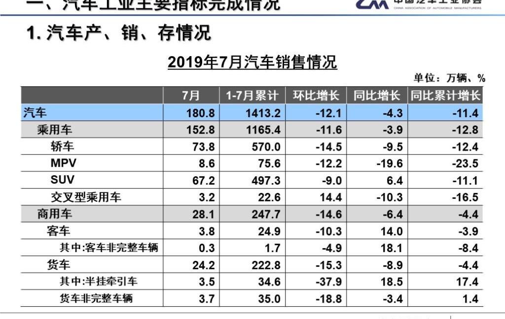 8月12日,中汽協發布了2019年7月汽車行業產銷數據。7月份,汽車產銷同比降幅繼續收窄,產銷分別完成180萬輛和180.8萬輛,比上月分別下降5%和12.1%,比去年同期分別下降11.9%和4.3%,同比降幅分別為5.4和5.3個百分點。2019年1-7月,汽車產銷分別完成1393.3萬輛和1413.2萬輛,比上年同期分別下降13.5%和11.4%,產銷降幅比1-6月分別收窄0.2個和1個百分點。從7月產銷數據完成情況來看,產銷呈現同比下滑。雖然整體降幅繼續收窄,但行業產銷整體下滑的局面沒有根本改變。7月進入傳統汽車銷售淡季,環比出現下滑。本月只有SUV和客車出現同比增長,其他車型均出現下降。此外,由于上月新能源補貼過渡期結束,本月新能源乘用車銷量大幅下降,直接影響了新能源汽車整體增速。從1-7月產銷情況來看,汽車整體產銷仍處于低位。隨著國六車型越來越多,企業的促銷力度會有所降低,消費者的觀望情緒有望得到改善。