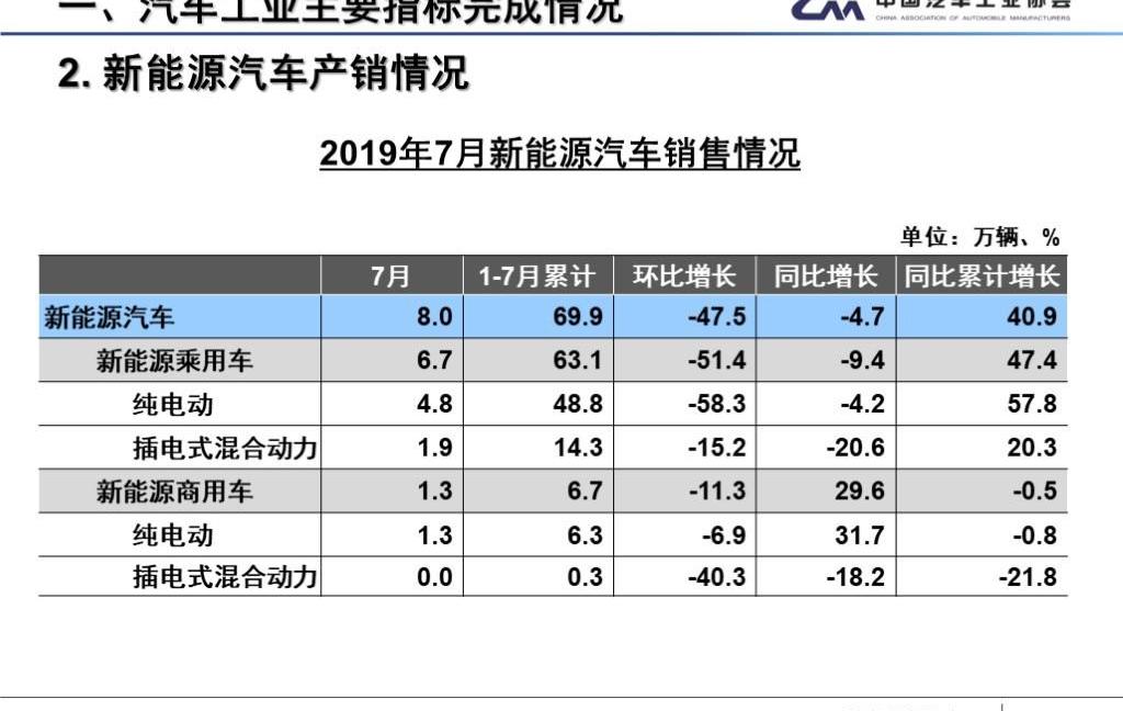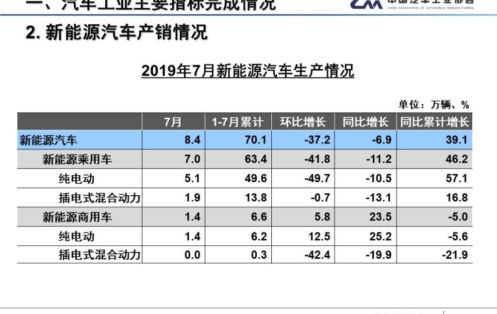 中汽協秘書長助理徐海東表示,在市場持續負增長的情況下,中汽協近期調整了預期銷量,其中新能源汽車預期銷量由160萬輛調整為150萬輛。7月份同比下降主要受兩方面因素影響:一是6月份補貼過渡期結束,大致部分購車需求提前釋放,6月份處于較高水平,7月份下調正常;其次,在切換期間,車輛在國內的性價比對非限購城市的車主更有吸引力。徐海東還表示,國五國六的切換已經基本完成,對新能源汽車的影響基本結束。按照以往的基本趨勢,下半年新能源汽車將保持穩定增長。8月12日,中汽協發布了2019年7月汽車行業產銷數據。7月份,汽車產銷同比降幅繼續收窄,產銷分別完成180萬輛和180.8萬輛,比上月分別下降5%和12.1%,比去年同期分別下降11.9%和4.3%,同比降幅分別為5.4和5.3個百分點。2019年1-7月,汽車產銷分別完成1393.3萬輛和1413.2萬輛,比上年同期分別下降13.5%和11.4%,產銷降幅比1-6月分別收窄0.2個和1個百分點。從7月產銷數據完成情況來看,產銷呈現同比下滑。雖然整體降幅繼續收窄,但行業產銷整體下滑的局面沒有根本改變。7月進入傳統汽車銷售淡季,環比出現下滑。本月只有SUV和客車出現同比增長,其他車型均出現下降。此外,由于上月新能源補貼過渡期結束,本月新能源乘用車銷量大幅下降,直接影響了新能源汽車整體增速。從1-7月產銷情況來看,汽車整體產銷仍處于低位。隨著國六車型越來越多,企業的促銷力度會有所降低,消費者的觀望情緒有望得到改善。