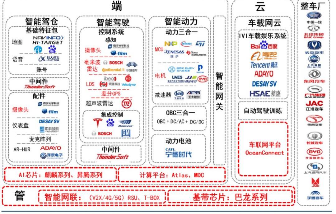 圖2:華為布局下的車聯網產業鏈全景。目前,華為已在智能網聯汽車領域提出解決方案,包括基于MDC(移動數據中心)的車載計算平臺和智能駕駛子系統解決方案,基于華為云的自動駕駛(訓練、仿真、測試)云服務Octopus,4G/5G車載移動通信模塊、T-BOX和車載網絡,以及華為HiCar的全場景無縫互聯解決方案。中信建投認為,基于華為在5G、物聯網、通信等領域的技術優勢和布局,華為在智能汽車、車聯網領域的收入增量有望達到數百億美元。中信建投預測,未來十年,華為在智能汽車中的電子元件銷售額有望達到500億美元的量級,成為與博世并駕齊驅的汽車電子巨頭。本文來自未來汽車日報作者:程小逸智能世界正在加速,給了ICT玩家進入汽車行業的機會。8月8日,華為發布了《全球產業展望GIV@2025》白皮書,預測到2025年,全球58%的人口將能夠使用5G網絡,全球15%的車輛將嵌入C-V2X(蜂窩車對一切)蜂窩車聯網技術。當天,華為與沈陽市政府達成合作,建立智能網聯汽車測試示范區。