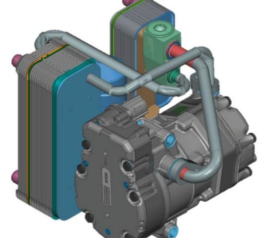 為了解決這個問題,馬勒將不同的熱管理組件集成到一個多模式操作系統中——ITS。該系統的核心是由冷卻器、間接冷凝器、熱力膨脹閥和電動壓縮機組成的半封閉制冷劑回路。間接冷凝器和冷卻器相當于傳統制冷劑回路中的冷凝器和蒸發器。與傳統的風冷方式不同,該系統中制冷劑和冷卻液進行熱交換,因此產生兩種冷卻液流。它以R1234yf為制冷劑,以傳統的汽車冷卻液為介質,使汽車冷卻回路與各種熱源、散熱片進行熱傳導。在緊湊型電動汽車的道路測試中,馬勒驗證了其集成熱管理系統顯著減少續航里程損失的能力,尤其是在低溫環境下。原車采用傳統電加熱方式的續航里程為100公里,加裝ITS后,續航里程增加到了116公里。