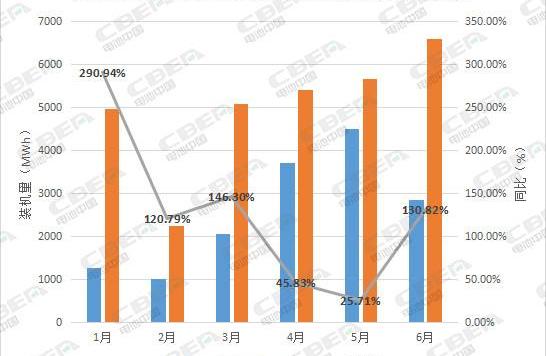 (數據來源:動力電池應用分會研究部)從上圖可以看出,與2018年同期相比,2019年上半年各月裝機量呈現明顯增長趨勢,同比增幅最低為25.71%,最高為290.94%。此外,與2018年不同的是,2019年前6個月的月度裝機量從2月份開始持續上升和攀升,并在6月份達到上半年裝機量的峰值,達到6613.32MWh。