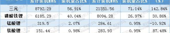 據動力電池應用分會研究部統計,2019年上半年,我國新能源汽車動力電池總裝機容量為30014.37MWh,同比增長94.29%。其中三元電池和磷酸鐵鋰電池仍占據絕對優勢,總裝機量占比98.11%,比2018年同期的96.95%提升了一個多百分點。