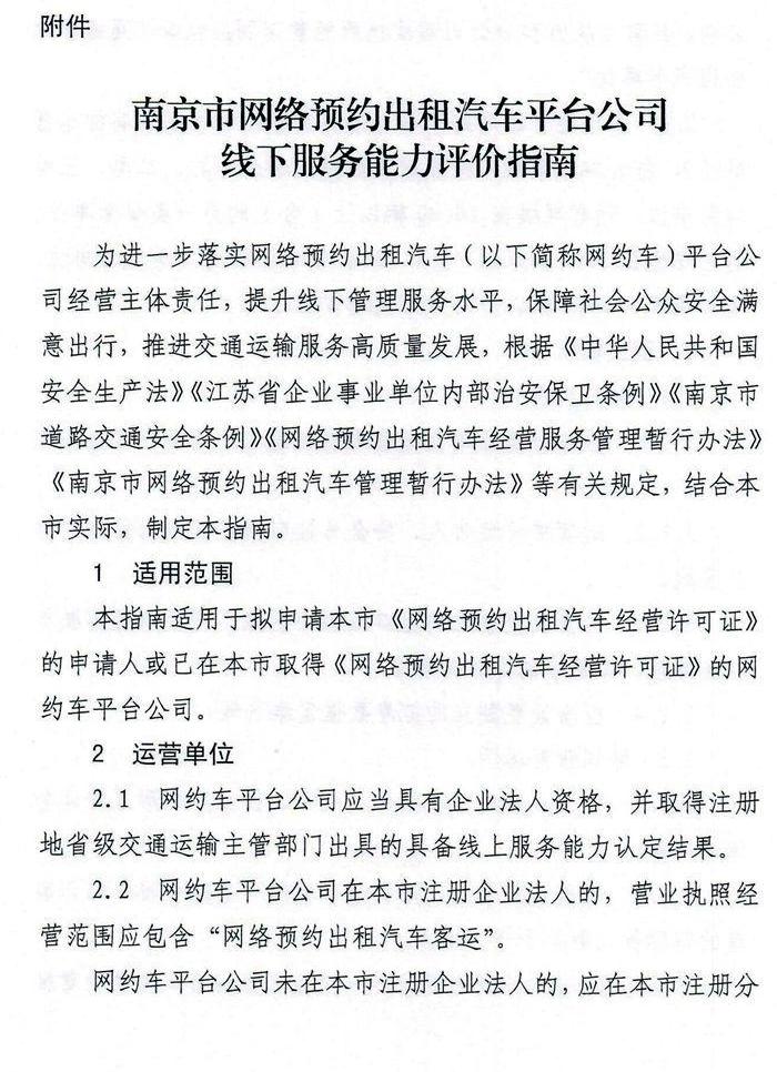 近日,南京市交通運輸局發布《南京市網絡預約出租汽車平臺公司線下服務能力評估指南》。《指南》對運營單位的經營資質、經營場所、運營車輛、運營管理、安全管理、信息數據、企業信用等提出了要求,并制定了詳細的評價標準。《指南》明確提出,運營車輛應為純電動汽車,應符合國家相關技術標準,屬于《新能源汽車推廣應用推薦車輛目錄》。車輛軸距應達到2650 mm以上,純電動汽車續航里程不低于300 km。