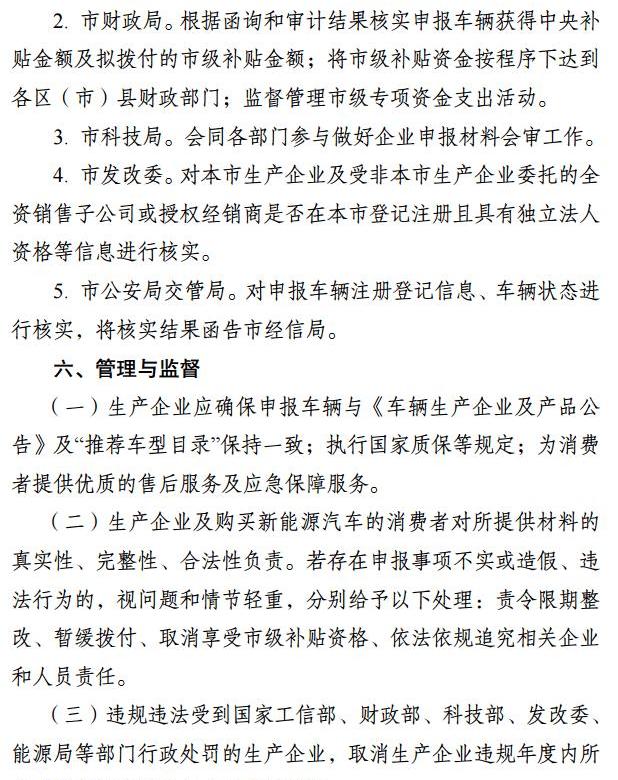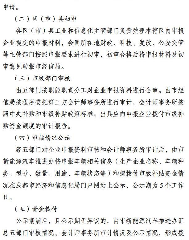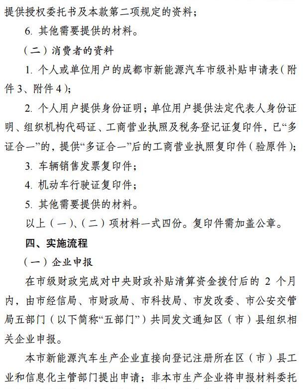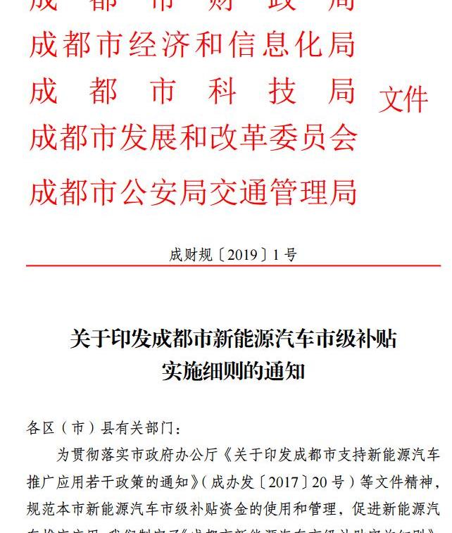 近日,成都市財政局等五部委聯合發布的《關于印發成都市新能源汽車市級補貼實施細則的通知》指出,在中央財政補貼的基礎上,將中央財政自行車補貼的50%給予市級配套補貼。通知稱,新能源汽車生產企業銷售新能源汽車產品時,按照扣除中央和市補貼后的價格與消費者結算。對符合申報條件的補貼對象和產品,獲得中央財政補貼的,生產企業應按規定如實申報市級補貼。本實施細則自發布之日起施行,適用于2017年1月1日至2019年6月25日在成都市車管部門登記的新能源汽車(2017年1月1日至2019年12月31日適用于新能源客車和燃料電池汽車)。