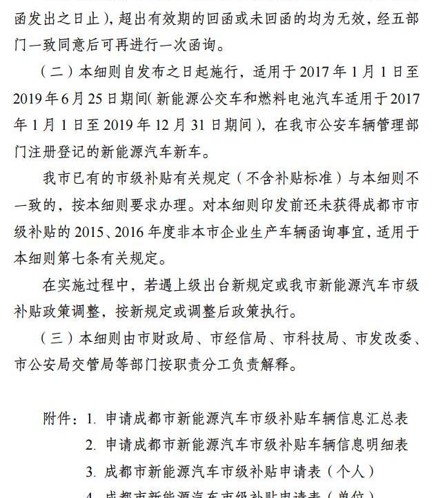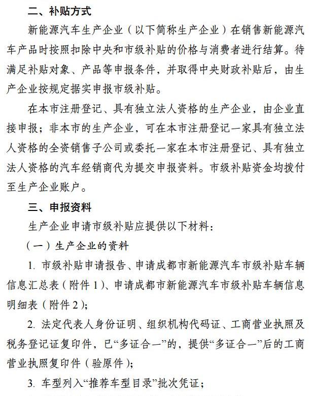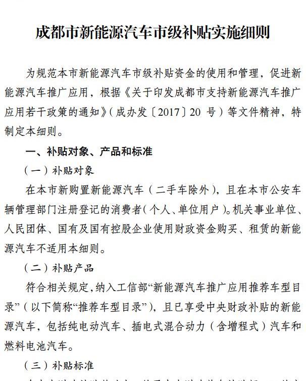 近日,成都市財政局等五部委聯合發布的《關于印發成都市新能源汽車市級補貼實施細則的通知》指出,在中央財政補貼的基礎上,將中央財政單車補貼的50%給予市級配套補貼。通知稱,新能源汽車生產企業銷售新能源汽車產品時,按照扣除中央和市補貼后的價格與消費者結算。對符合申報條件的補貼對象和產品,獲得中央財政補貼的,生產企業應按規定如實申報市級補貼。本實施細則自發布之日起施行,適用于2017年1月1日至2019年6月25日在成都市車管部門登記的新能源汽車(2017年1月1日至2019年12月31日適用于新能源客車和燃料電池汽車)。