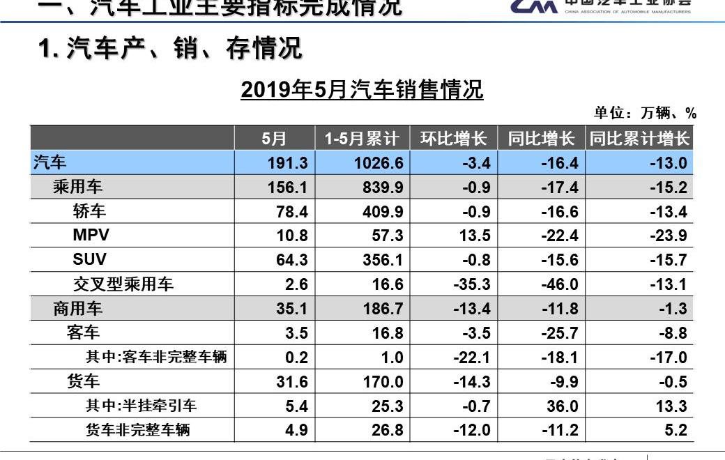 6月12日,中汽協發布了2019年5月汽車行業產銷數據。5月份,汽車行業產銷整體下行趨勢仍未得到有效緩解,產銷同比降幅有所擴大,產銷分別完成184.8萬輛和191.3萬輛,比上月分別下降9.9%和3.4%,比去年同期分別下降21.2%和16.4%,分別提高6.7和1.8個百分點。2019年1-5月,汽車產銷分別完成1023.7萬輛和1026.6萬輛,均比上年同期下降13%,降幅分別比1-4月擴大2個和0.8個百分點。