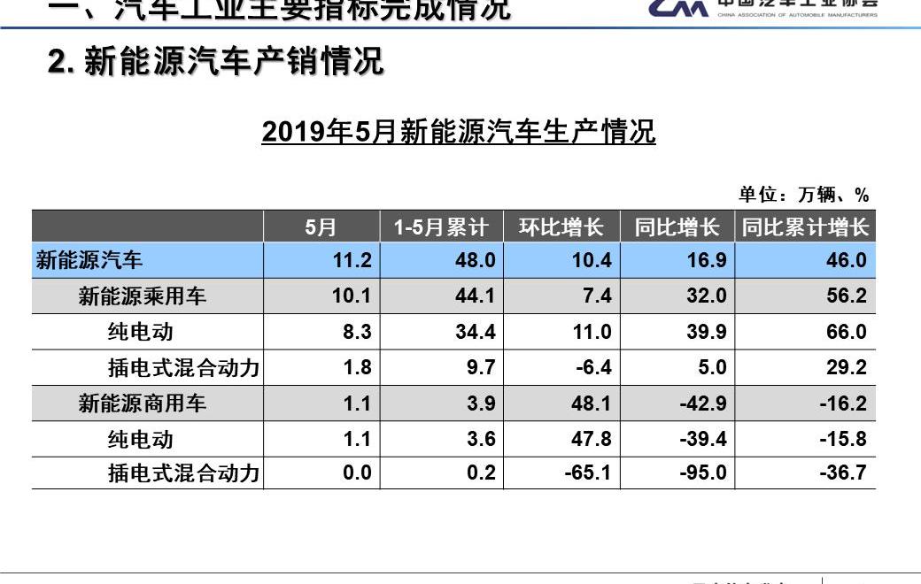 2019年前5個月,新能源汽車產銷分別完成48萬輛和46.4萬輛,同比分別增長46.0%和41.5%。其中,純電動汽車產銷分別完成38萬輛和36.1萬輛,同比分別增長52.0%和44.1%;插電式混合動力汽車產銷分別完成9.9萬輛和10.3萬輛,同比分別增長26.4%和32.7%。燃料電池汽車產銷分別為553輛和545輛,同比分別增長476.0%和479.8%。