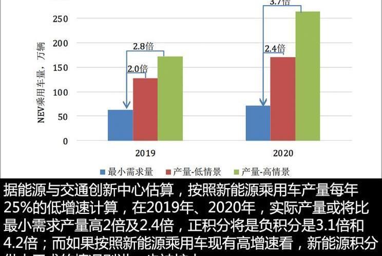 新的雙重信貸政策調整方案將改善目前新能源信貸供過于求和行業平均油耗表現不佳的狀況;2.新方案主要包括五大調整,不僅將首次引入經濟處罰,還將鼓勵低油耗汽車,包括混合動力汽車;3.新的雙積分調整方案仍將是階段性政策,或將于今年6月公開征求意見,今年年底前發布。現行雙積分政策的“雞肋”在哪里?雙重授信政策是2017年9月發布的《乘用車企業平均燃料消耗量與新能源汽車授信并行管理辦法》。這一政策在發布之初就引起了業內的高度關注,但后來由于其相對寬松的考核條件,幾乎人人都能通過標準,遠未達到政策的初衷。雖然該政策中有一系列復雜的考核方式,但簡而言之,就是“懲罰”那些對發展新能源汽車不積極或者對傳統節能技術應用不夠的車企,讓他們通過購買積極的新能源積分來“獎勵”新能源領域的優秀車企。據全國客運協會秘書長崔東樹介紹,新能源積分的成交價僅為100-200元。從目前新能源市場的表現來看,2019年汽車行業達到10%的難度不大。根據全國客聯發布的評分報告,2019年1-4月新能源乘用車產量340000輛,新能源評分達到560000分,新能源評分達到21%,遠超考核比例要求10%。這意味著2018年新能源分數供大于求的現象將持續到2019年。此外,能源與交通創新中心發布的《2019-2020年中國乘用車企業新能源汽車授信合規與預測》顯示,以25%的年增長率計算,預計2019年和2020年新能源汽車產量將分別達到150萬輛和200萬輛。但以乘用車企業新能源積分10%和12%的達標比例計算,這兩年所需新能源乘用車產量將僅為62萬輛和71萬輛。這意味著新能源整體供大于求的現象將在此后很長一段時間內持續。