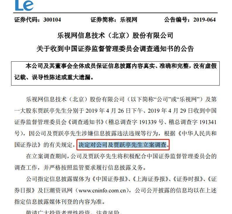 又一個私募冠軍“倒下”了!債務纏身,數億股權拍賣“無人問津”,更多監管罰款,質押清算...2小時突破200億!六大科技基金已篩選完畢,“一日售罄”已無懸念。最晚18點他們就要“上車”了,配售比例創700億金誠集團歷史新低!80后老板被抓,剛確認涉嫌非法集資!5天前,我還發文呼吁投資者“耐心冷靜”。所有人都驚呆了!1000億瘋狂買這7只科技基金,銀行券商瘋狂拋售,900多億退款在路上!監管部門對賈躍亭!樂視網面臨即將暫停上市。中國證監會對該公司及其創始人和第一大股東賈躍亭涉嫌非法信息披露進行了調查。4月26日,樂視發布2018年年報,巨虧41億元,凈資產為負。深交所將決定是否暫停上市和股票停牌。今年一季度繼續虧損1.77億元。說了一句“負責到底”,賈躍亭2017年7月飛到美國至今未歸,留下一段“下周回國”;現在已經立案調查,不知道賈躍亭什么時候回來,如何“將責任進行到底”。賈躍亭的最新微博停留在2019年4月11日,依然發布了自己造車生涯和法拉第未來FF91賽車的信息,但沒有回國的跡象。最新數據顯示,樂視網股東人數為25.72萬人。監管層調查樂視和賈躍亭樂視。29日晚間公告稱,公司及其第一大股東賈躍亭分別于2019年4月26日下午和2019年4月29日收到中國證監會的《調查通知書》。因公司及賈躍亭涉嫌信息披露違法,根據《中華人民共和國證券法》的有關規定,決定對公司及賈躍亭立案調查。調查期間,公司及賈躍亭將積極配合中國證監會的調查,并嚴格按照監管要求履行信息披露義務。