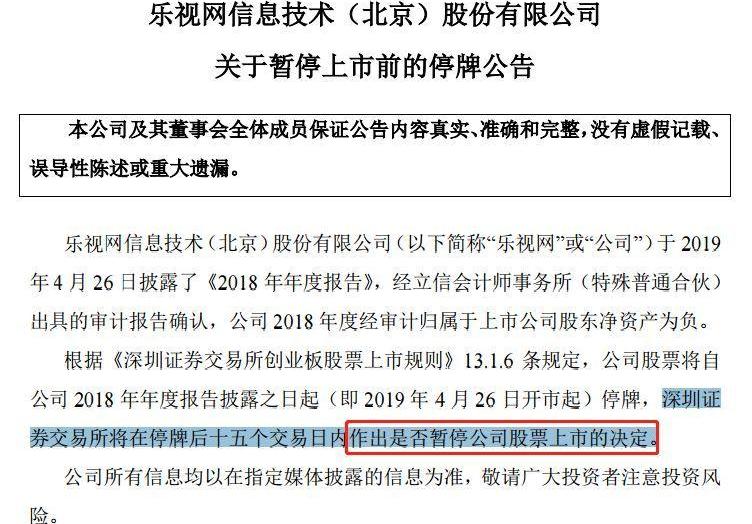 樂視網面臨暫停上市,就在監管層對樂視網和賈躍亭展開調查之際,樂視證券面臨暫停上市。4月26日,樂視發布2018年年報,巨虧40.96億元,凈資產為負30.26億元。樂視網凈資產為負,深交所將在停牌后15個交易日內作出是否暫停公司股票上市的決定。股票自4月26日起停牌。