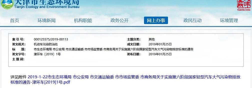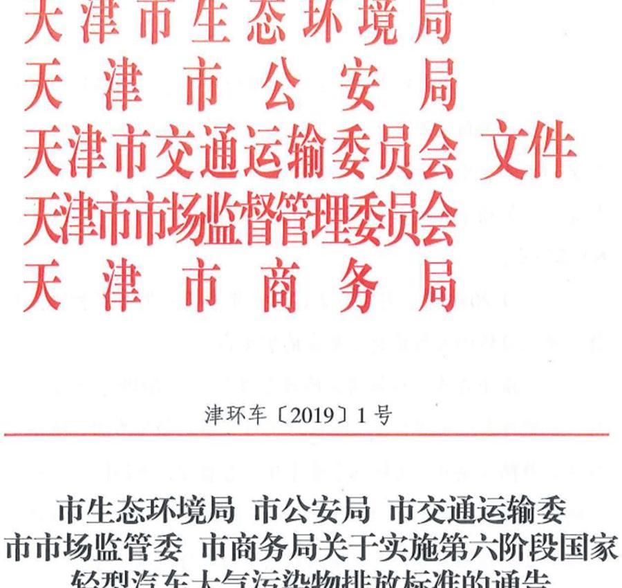 1月25日,天津市生態環境局網站發布了《市生態環境局長、市局、市交通委、市市場監管委、市商務局關于實施輕型汽車第六階段國家大氣污染物排放標準的通知》。根據通知,自2019年7月1日起,停止銷售、注冊和轉讓不符合第六階段國家排放標準要求(I型實驗符合6b階段排放限值要求)的輕型汽車。天津將直接進入“國六B”階段。