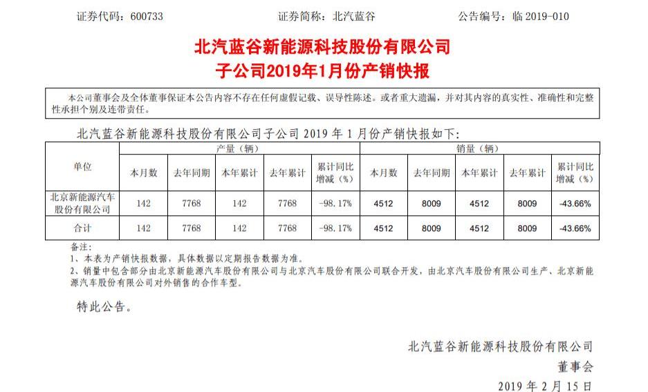 2月16日,北汽新能源母公司北汽藍谷發布2019年1月產銷快報。公告顯示,1月份,北汽新能源生產新能源汽車142輛,同比大幅下降98.17%;從銷量來看,1月新能源汽車累計銷售4512輛,同比下降43.66%。