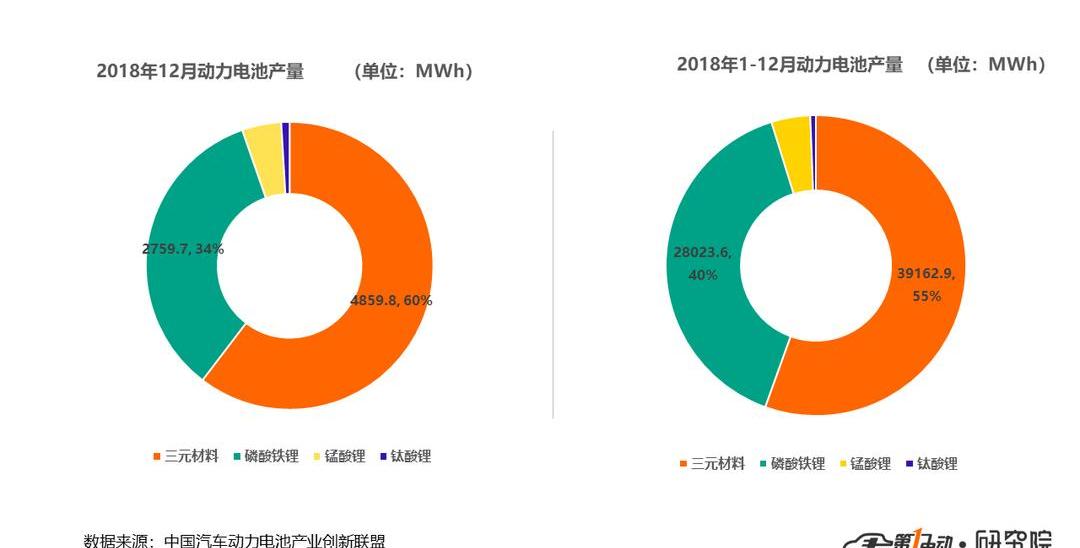 1月14日,中國汽車動力電池產業創新聯盟發布了2018年12月及全年新能源汽車電池產銷及裝機容量數據。從產量來看,2018年12月,我國動力電池總產量為8.0Gwh,比上月下降1.6%,其中三元電池產量為4.9GWh,占總產量的60.4%,比上月下滑6.8%;磷酸鐵鋰電池產量為2.8GWh,占總產量的34.3%,比上月增長2.2%。2018年,我國動力電池累計產量達到70.6GWh,其中三元電池累計產量為39.2GWh,占總產量的55.5%。磷酸鐵鋰電池累計產量28.0GWh,占總產量的39.7%;其他材料電池占4.8%。