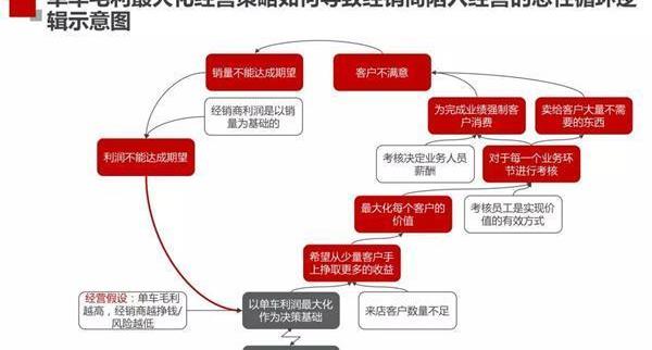 主機廠的生產是根據年度預測組織的,因此當風險來臨時,反應會延遲,預期的車輛仍可能離線并轉移給經銷商。我們真實地見證了這一市場變化對汽車經銷商的影響,甚至看到了壓力下的自救導致2018年最后兩個月庫存被處置,并完全侵蝕了前十個月的業績。轉型時代已經到來,這已經是汽車經銷商行業的共識。任何行業的發展都不可能永遠保持高增長。每個行業經歷萌芽階段、高速增長階段再到成熟階段都是必然的路徑,汽車行業也不例外。年輕的汽車行業要想成熟,唯一的辦法就是減緩行業的增長速度,加劇競爭,惡化行業的生存環境。因此,不管我們喜歡與否,這將成為我們這一代汽車機器人的新常態。新的商業環境需要新的商業理念,那么所謂的汽車經銷商轉型是什么呢?這是汽車投資者和高級管理人員必須回答的第一個問題。這就要求我們首先明確我們目前的管理思想是什么。汽車經銷商需要改變的管理方法是什么?無論您是否同意,幾乎每個集團/分銷商都有自己的管理方法論,不同之處在于我們是否實現和完善了它,而這種方法論是基于OEM輸入的管理框架,并整合了分銷商的實踐智慧。在汽車經銷商行業,這種通用的經營策略可以概括為“自行車利潤最大化經營策略”:通過盡一切努力提高每輛車的利潤,我們可以實現企業的利潤目標。這是當前汽車經銷商需要改變的一貫經營策略。自行車利潤最大化戰略在過去二十年中一直是一種有效的商業戰略,為經銷商的運營帶來了巨大的成功。然而,任何經營方式都有一個有效的前提,自行車利潤最大化經營策略的有效前提是:供不應求,客戶具有高溢價能力。在行業轉型的背景下,我們逐漸失去了確保這種方法論有效性的前提,使其不再適用。任何管理方法或管理行為,如果不適用,肯定會成為制造問題的根源。原因是,任何商業戰略一旦形成,都將與現實和常識相結合,并受因果律的支配。4.新環境下的舊觀念是如何導致商業惡性循環的?以下是經銷商基于自行車利潤最大化的經營策略如何導致商業惡性循環的簡要說明:在行業經營環境發生變化后,我們繼續堅持以自行車利潤最大限度為經營決策基礎的經營策略。在目前的商業環境下,我們來店里的顧客數量不足。這種商業現實與自行車利潤最大化的結合將使經銷商希望在運營中從少數客戶那里贏得更多利益。同時,它將進一步引導我們實現每個客戶的價值最大化。在經理看來,評估員工是實現價值最大化的有效途徑,因此這會導致經銷商經理傾向于評估每個業務環節。在經銷商的運營中,考核決定了員工的工資,因此可能會導致業務人員強迫客戶消費或向客戶出售大量不必要的產品,以完成他們的業績。這樣的行為必然會導致客戶的不滿,進而影響銷量。對于特定的經營主體來說,汽車經銷商的利潤最終是基于銷售規模,這將進一步導致經銷商的營業利潤達不到預期。如果利潤達不到預期,經銷商會怎么做?大多數經銷商會選擇進一步追求自行車利潤的最大化,從而導致經銷商經營的惡性循環。