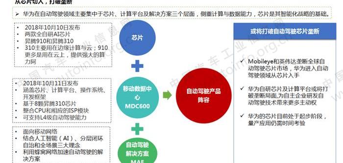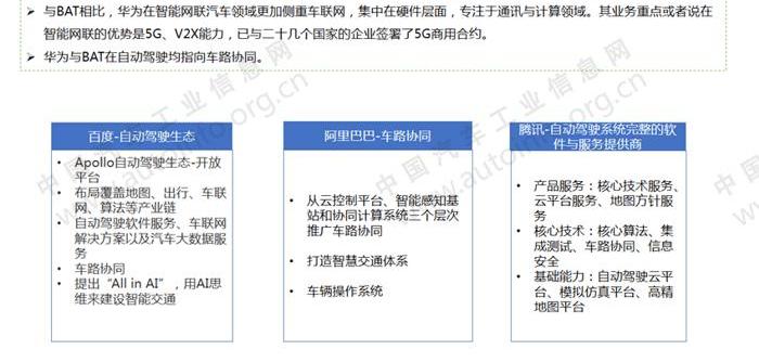 華為結合自身在通信、5G和硬件領域的技術優勢,通過網絡、車聯網和車計算三大服務切入智能網聯汽車行業。2018年,華為在汽車領域發展迅速,成為中國智能網聯汽車發展的重要力量。
