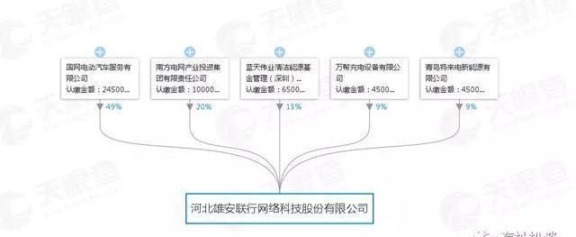 合資公司名稱為河北雄安聯航網絡科技有限公司有限公司,注冊資本5億元,國網電動車出資2.45億元人民幣,占注冊資本的49%;南方電網產業投資出資1億元,占注冊資本的20%;藍天偉業對清潔能源的出資額為6500萬元,占注冊資本的13%;特來電的出資額為4500萬元,占注冊資本的9%;