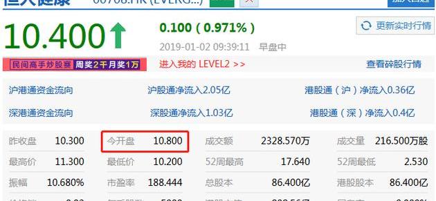 1月2日早間消息,恒大健康(00708.HK)股價今日大幅上漲至10.8港元,漲幅達4.85%。